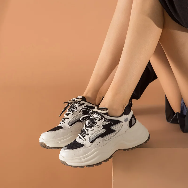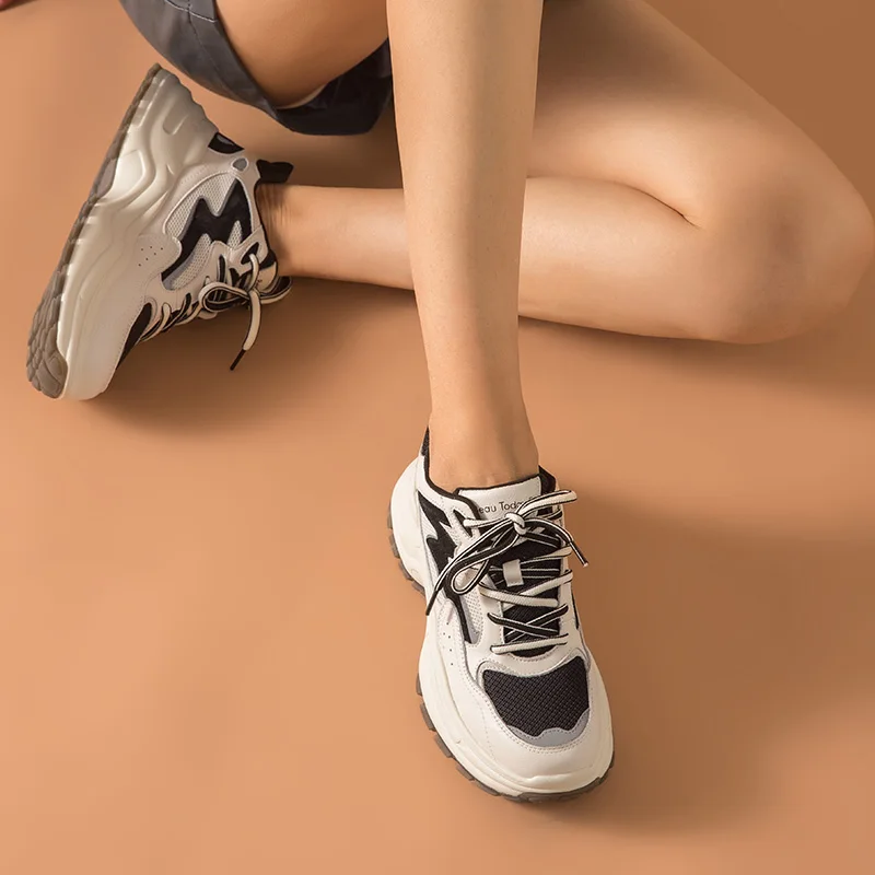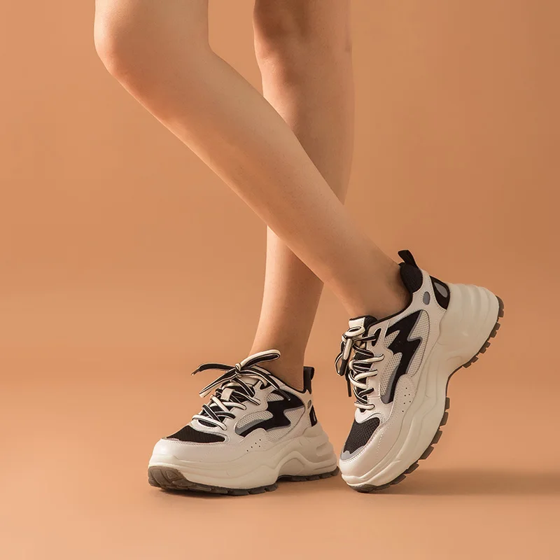 Special Offer BeauToday Chunky Sneakers kobiety krowa skórzana siatka w stylu Retro sznurowane mieszane kolory Lady Casual grube buty Handmade 29326 Discount 45% Today!
