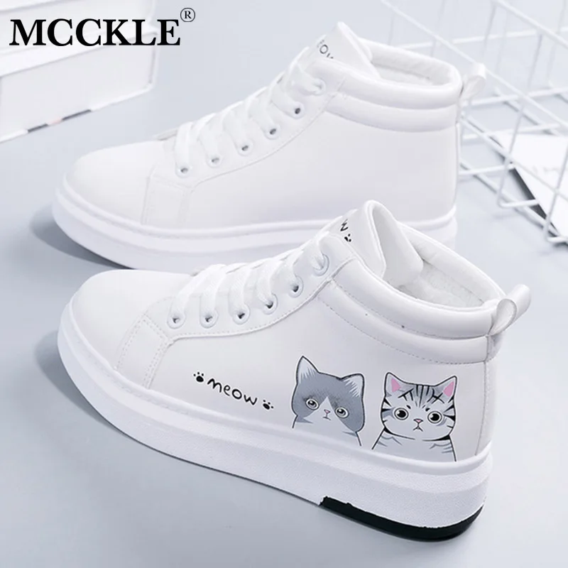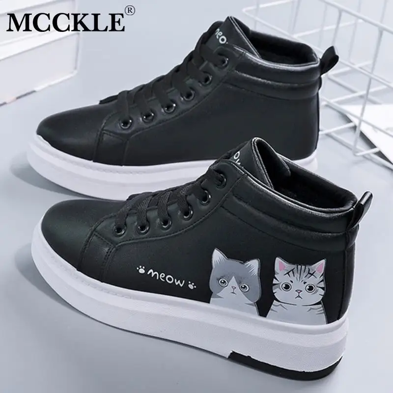 Special Offer MCCKLE damskie wysokie trampki śliczne kobiety zasznurować buty wulkanizowane płaskie damskie PU kobieta pluszowe ciepłe wygodne gorące kobiece nowe Discount 60% Today!